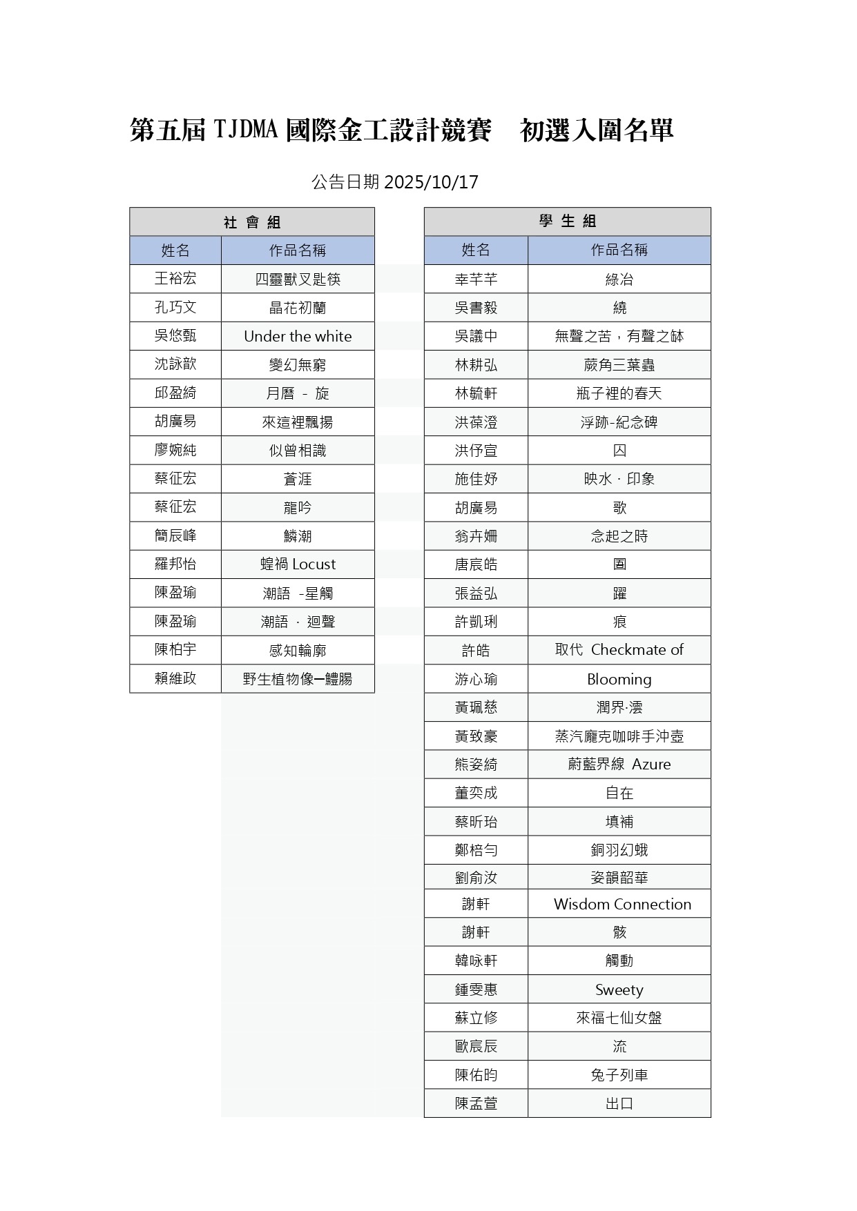 收件地址:103台北市大同區迪化街一段32巷14號2樓,光在金工,註明第五屆TJDMA國際金工競賽收件處收 決選送件時,為避免送件過程中實體作品受損,實體作品請自行妥善包裝,確認緩衝材是否 足夠、妥當,若因包裝不妥造成郵寄過程中物件受損本協會不負相關責任。 作品包裝尺寸其長寬高總和不超過150公分,《附件ㄧ、送件表》應確實黏貼於包裝盒外,內並檢附《附件 二、切結書》。 不符規定格式之作品將無法參與評選,後續將通知參賽者自行取回,本協會不主動郵寄退件。 ※社會組參賽者暫不需繳交任何費用。於決選得獎後,得獎者才需繳交競賽活動相關行政費用每件作品 1000 元整,未繳交者取消其獎項。 |